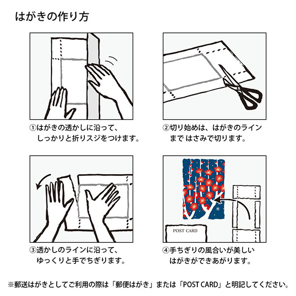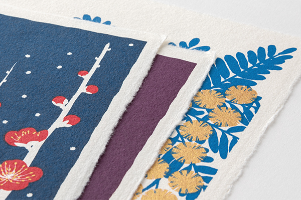 Appréciez la texture du papier washi de haute qualité, les motifs audacieux, les couleurs simples et l’éclat délicat de la sérigraphie dorée utilisée dans certaines régions. Ce petit format peut être utilisé comme carte postale déchirée à la main après l’avoir exposée.