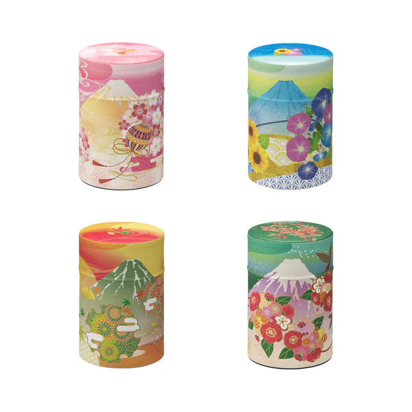 Boîte en metal recouverte de papier washi traditionnel japonais, ornée de motifs du mont Fuji et représentant le printemps.