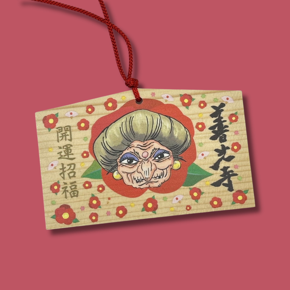 Il s’agit d’un ema (tablette votive) imprimé avec les mots « Temple Zenkoji » écrits par Suzuki Toshio et « Yubaba » du film Le Voyage de Chihiro.