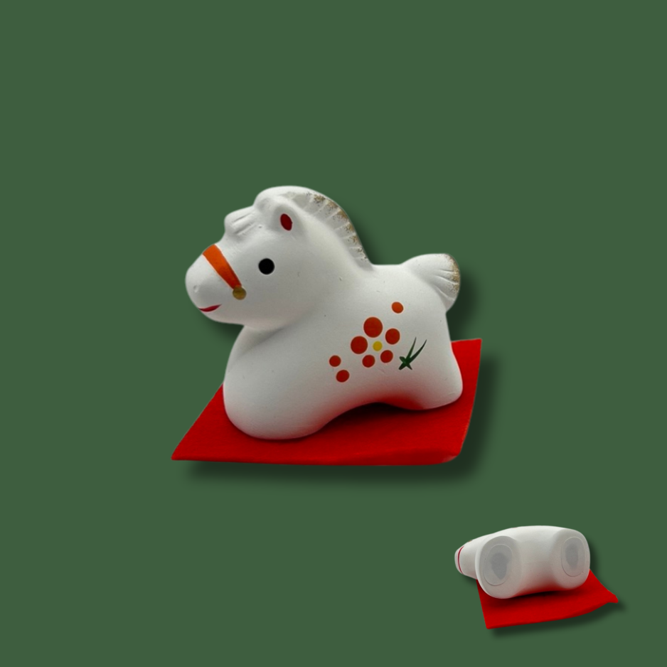 Figurine Cheval en céramique avec un petit socle rouge en feutrine. (ne contient pas d’Omikuji)