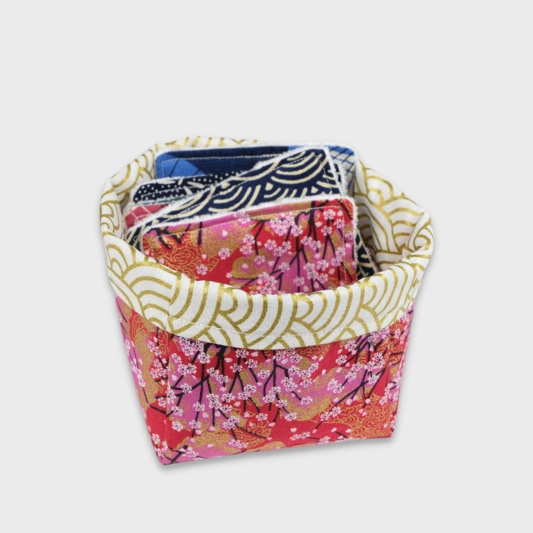 Le semainier de lingettes lavables en coton dans leur petit panier qui permettra de les ranger dans la salle de bains ou qui s’avérera très pratique en voyage.