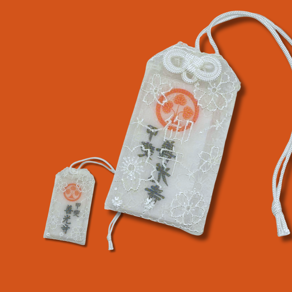 Omamori dentelles blanches, corde violette; plaque en plexi imprimée à l’intérieur.