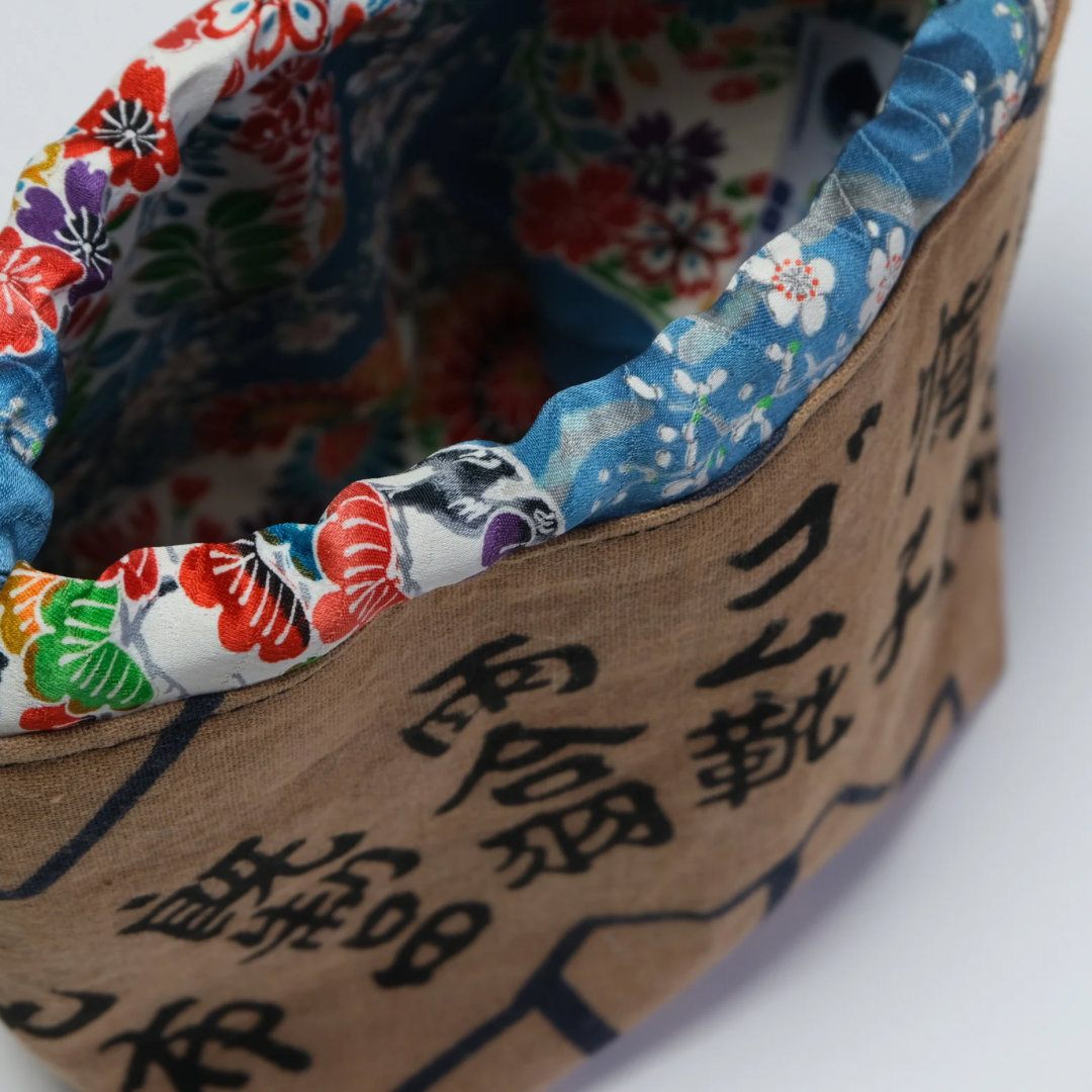 Pochette multi-usage en soie de Kimono et Tenugui en coton 100% upcyclée, elle est entièrement doublée et la fermeture facile se fait grâce à des cordons en tissu.